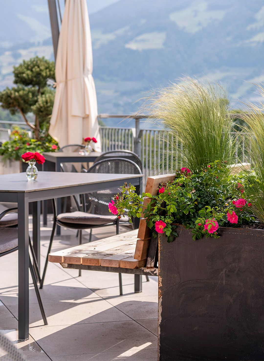 Grazie alla tenda parasole e ai riscaldatori, la terrazza è confortevole in ogni stagione – il luogo ideale per stare insieme, rilassarsi e godersi il paesaggio.