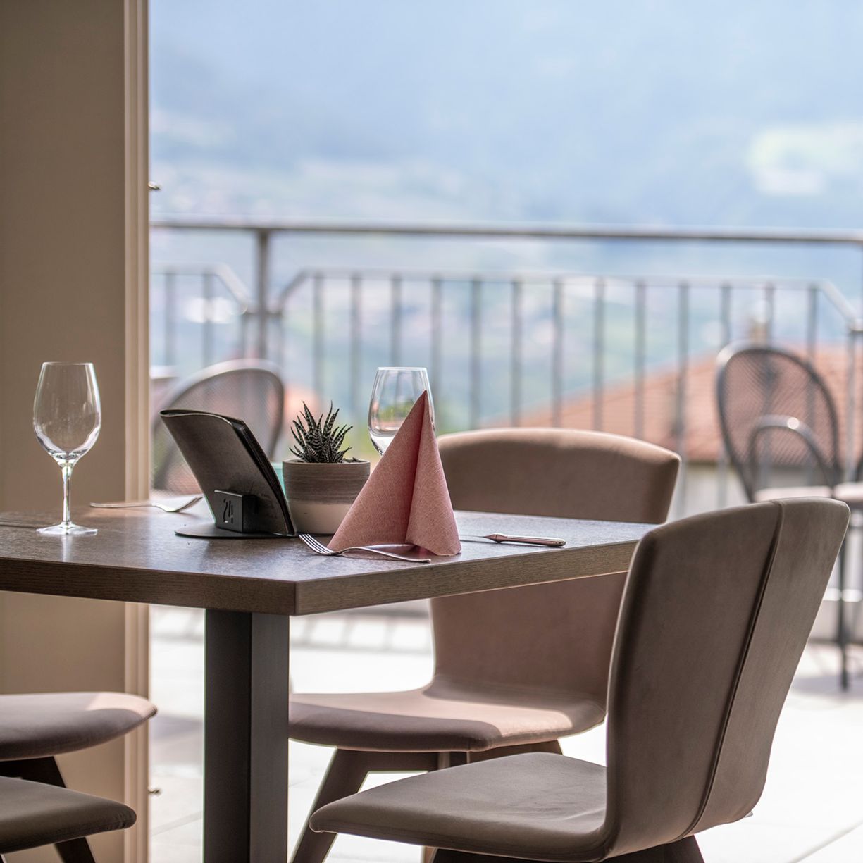 Nel nostro ristorante a Tirolo si incontrano accoglienza e panorama per creare un vero momento di piacere. Ogni ambiente ha il suo carattere: dalla terrazza principale, con 100 posti a sedere e una vista mozzafiato su Merano e la Val d’Adige, al solarium adiacente, con 30 posti all’aperto, perfetto anche come zona fumatori.